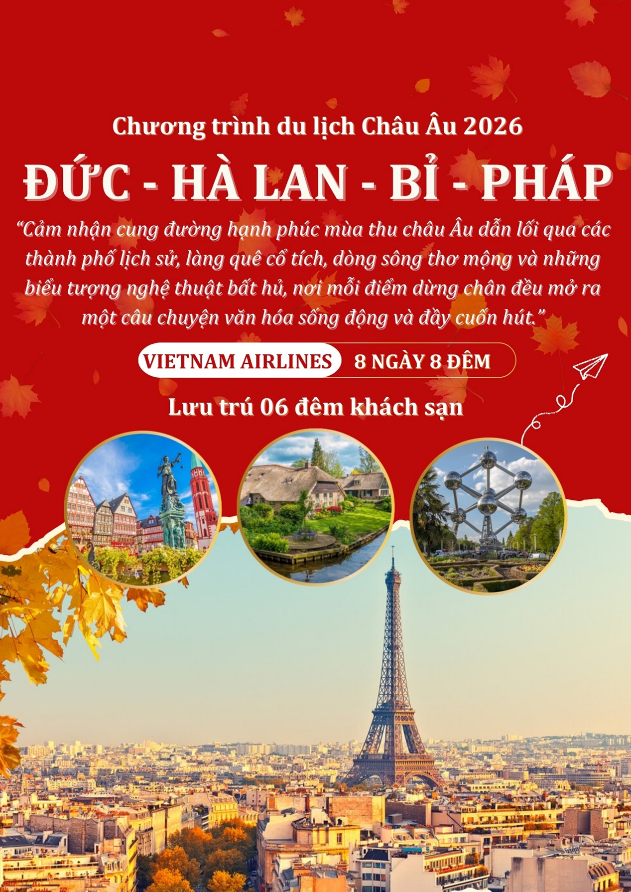 Tour du lịch Châu Âu 8N8Đ (Đức – Hà Lan – Bỉ – Pháp – Giethoorn) mang đến một hành trình đầy ấn tượng, kết hợp giữa sự cổ kính và lãng mạn. Du khách sẽ được trải nghiệm không gian thanh bình tại làng cổ tích Giethoorn – ngôi làng không có đường đi, chiêm ngưỡng vẻ đẹp rực rỡ của những cối xay gió tại Zaanse Schans và tận hưởng chuyến du thuyền trên sông Seine ngắm nhìn Paris hoa lệ. Ngoài ra, tour còn đưa bạn trải nghiệm hành trình bay thẳng của hàng không quốc gia Vietnam Airlines. Một số các điểm nhấn đặc biệt của chương trình tour mà Bạn có thể tham khảo là: