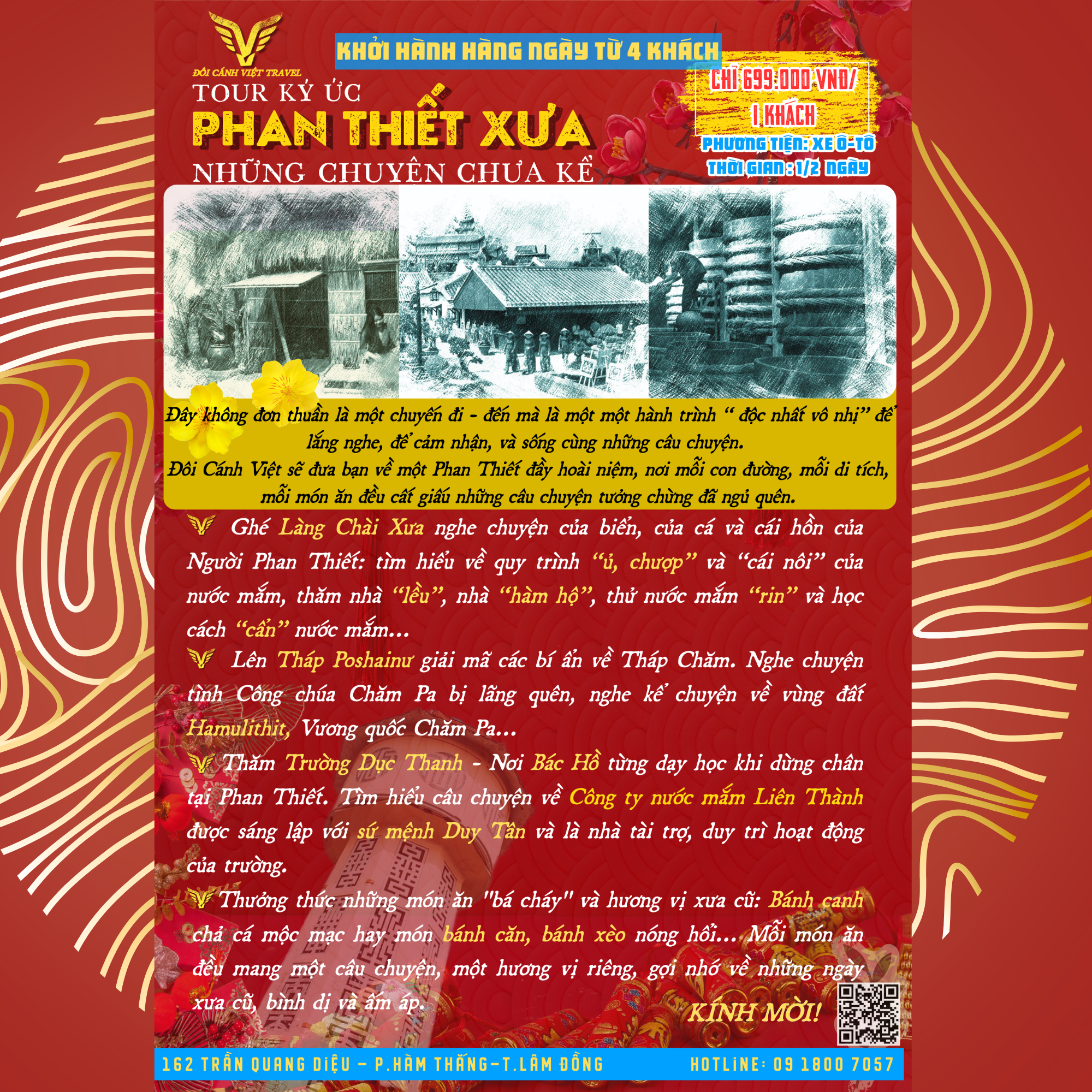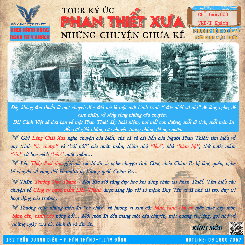 “Bạn đã bao giờ cảm thấy thiếu vắng một điều gì đó khi đi du lịch? Một chuyến đi không chỉ dừng lại ở việc check-in, chụp ảnh, mà còn là hành trình đi tìm những câu chuyện. Tour Ký Ức : “Phan Thiết Xưa – Những Chuyện Chưa Kể” không chỉ là một tour du lịch thông thường, mà là một hành trình “ độc nhất vô nhị” để lắng nghe, để cảm nhận, và sống cùng những câu chuyện. Chúng tôi sẽ đưa bạn trở về một Phan Thiết đầy hoài niệm, nơi mỗi con đường, mỗi di tích, mỗi món ăn đều cất giấu những câu chuyện tưởng chừng đã ngủ quên..”